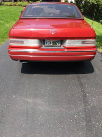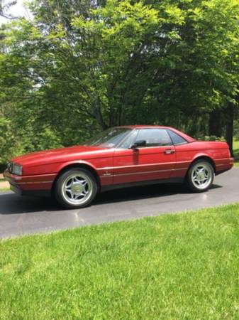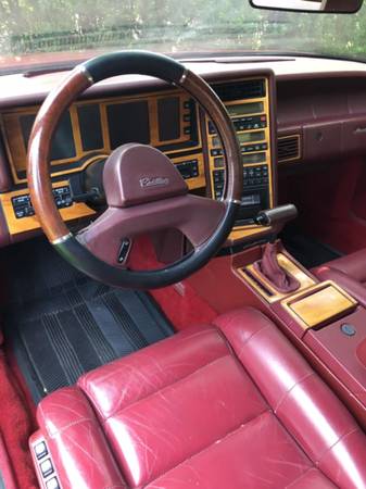 Sharp maroon metallic exterior with matching leather interior. Fully equipped with power windows, power seats, AC, cruise, AM/FM stereo with cassette player. 4.1L V8, automatic, removable hard top with tan soft top. Rare Cadillac chrome wheels with newer tires. Low 83k miles, nice luxury roadster.