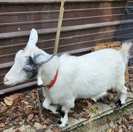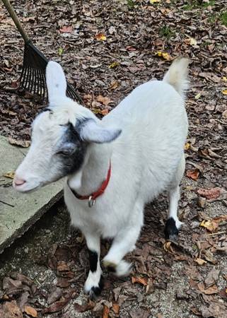 This is Luna she is a Dwarf nigerian doe goat around a year and a half old.She is hand shy but will walk and lead i have been working on her trust issues. She has never tried to bite or anything she is just hard to catch.