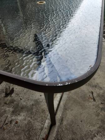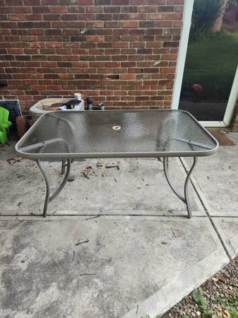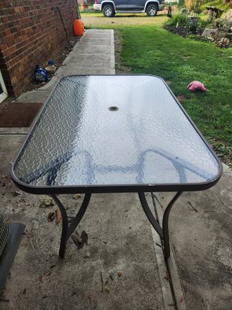 Glass Top Patio Table With Umbrella Hole. Measures 36-1/2" wide X 56-1/4" Long X 27-5/8" Tall. Sturdy, in good condition. Has some places around the trim edge where paint has come off or been...
