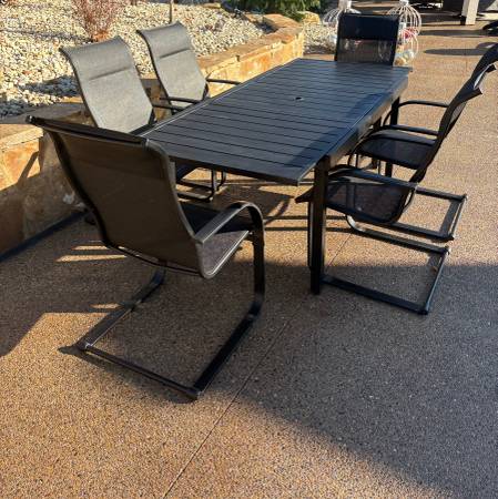 Outdoor dining set with 6 chairs, table is expandable from 62.5” x 35.25” to 84” x 35.35”, great shape. Please call or text.