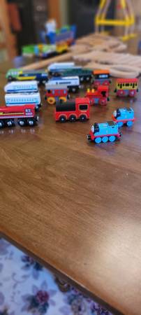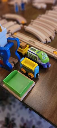 Assorted wooden track. Wooden trains with magnets. Chuggington wooden train track set. This set of assorted wooden track, accessories and trains has been stored in a tote when not being played with. A great addition to your wooden train collection. You can never get enough track.