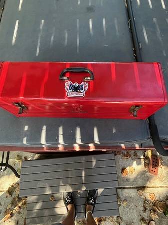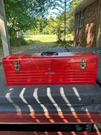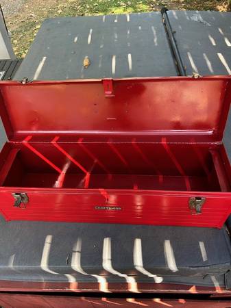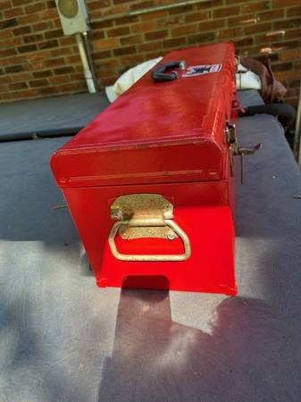 Sears Craftsman Red Carpenters Tool Box, 30" Long, Steel. Had minor surface rust on it so I prepped surface and re-coated it with red paint. Was going to use it on a trailer for tie-downs but changed my mind so it's for sale. Some minor rust also on hardware but won't hurt anything, see photos. Would make a nice box for long tools like pipe wrenches, etc. USA made.