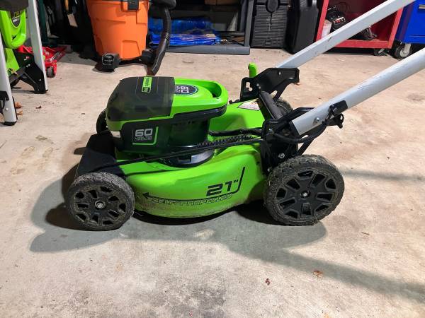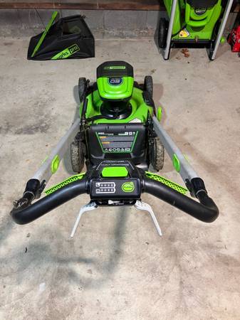 Greenworks 21” self propelled mower. Works quite well. Comes with clippings bag and 2 blades (3 total). I don’t have a battery to sell with it.